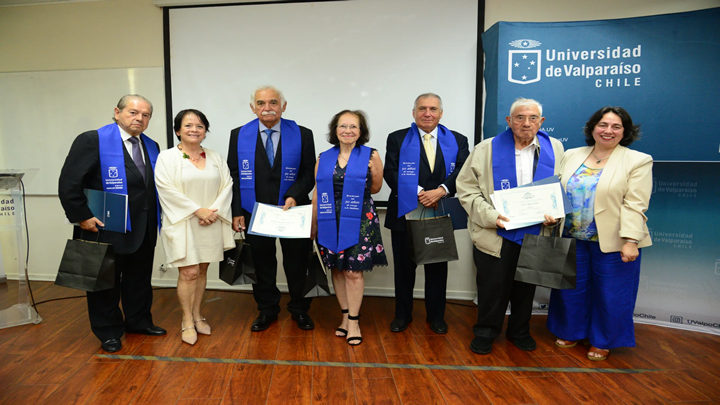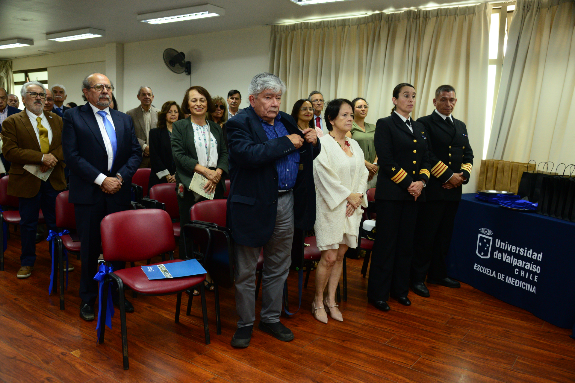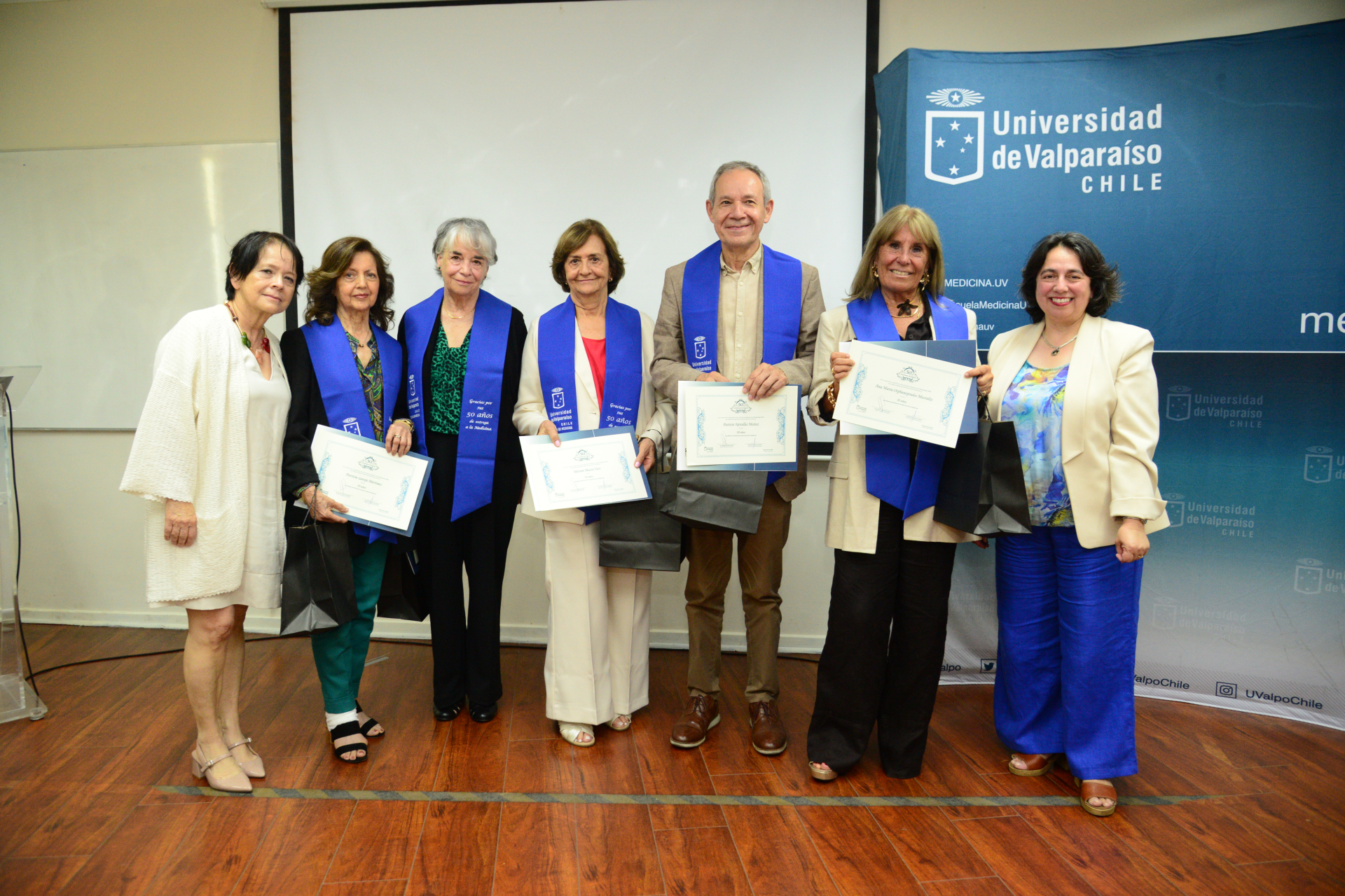 La ceremonia convocó a 23 egresados y egresadas de la promoción del ’75 en un homenaje encabezado por el director subrogante de Escuela, Julio Riquelme Alcázar; la directora de la Unidad de Calidad y Mejora Continua de la Escuela de Medicina, Viviana Lezana Soya, y la coordinadora de Vinculación con el Medio, Katherine Cuevas Lang. A ellos se sumó el presidente del Colegio Médico de Valparaíso, Luis Ignacio de la Torre, junto a otros invitados.